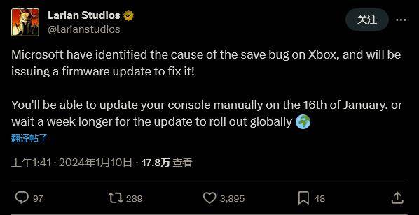 开发商拉瑞安工作室在推特上宣布:“微软已经确定了 Xbox 存档 BUG 的原因,并将发布固件更新来修复它。各位将能够在 1 月 16 日手动更新你们的主机,或者再等待一周,以便更新在全球范围内推出。虽然我们还无法亲自验证此修复,但我们乐观地认为微软已经彻查找到‘病根’了。”