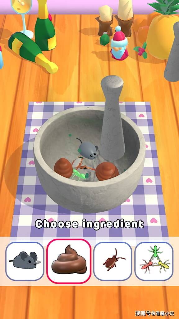 《Mask Mixture: ASMR Makeover》采用了被同类型游戏广泛使用的3D卡通画风,尽管在细节的呈现上略显粗糙,至少对于分辨具体物品的目标还是可以实现的。而且,为了避免部分原料的造型对玩家在视觉上造成不适,特地进行了调整与优化,例如老鼠的外观看上去更像是一个玩具,而粪便的形状与配色则更倾向于巧克力。(好吧,请不要脑补,也不要在最近无法直视巧克力)