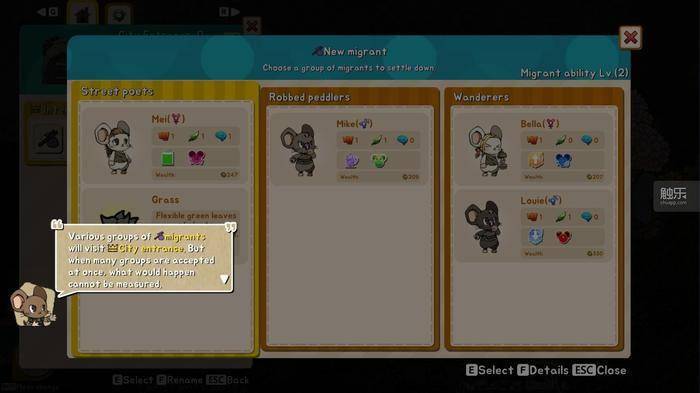 每位招募的鼠市民也有自己的个性和需求。需求有生理上的,也有心理上的。一旦缺乏娱乐、长久工作或者休息不足,就会影响他们的工作效率。玩家在招募时可以根据自己需要的能力挑选市民。等到王国发展起来,还可以进行一系列经济和财政上的经营。