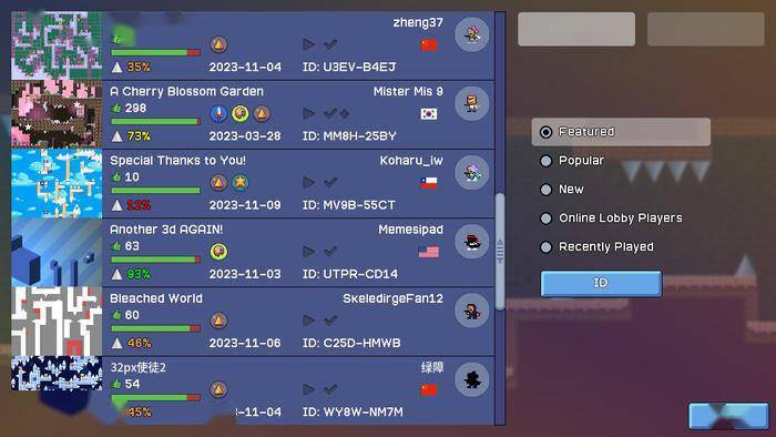 而标题中的“Maker”也在内容中有所体现,游戏将“I Wanna”系列一贯的高难度放在了社区和挑战关卡里。玩家可以游玩其他玩家制作上传的关卡,也可以自己制作关卡制作,或是挑战由随机关卡组成的挑战模式……内容堪称无穷无尽。