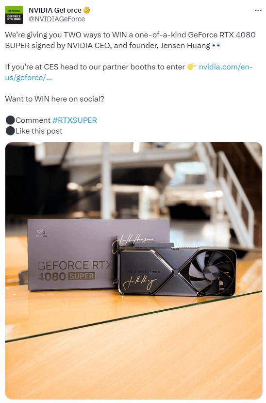 英伟达官方推特发起抽奖,点赞推文并在相关话题下评论即可参与,赢取CEO黄仁勋亲笔签名的一块公版RTX 4080 Super显卡。感兴趣的玩家可以试试手气。