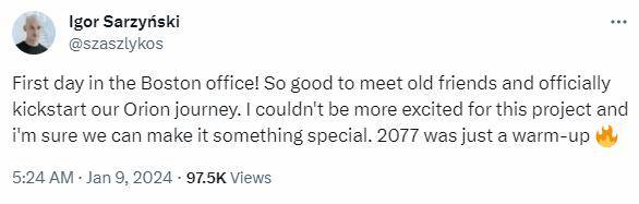 游戏的叙事总监Igor Sarzyński发文表示:“到达波士顿办公室的第一天!很高兴见到老朋友并正式开始我们的猎户座之旅。我对这个项目感到非常兴奋,我相信我们可以让它变得特别,《2077》只是热身。”