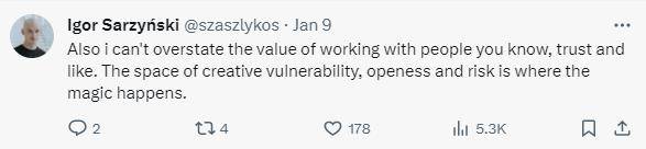 “此外,与你认识、信任和喜欢的人一起工作的价值再怎么强调也不为过。充满创造性、开放性和风险的空间才是奇迹发生的地方。”