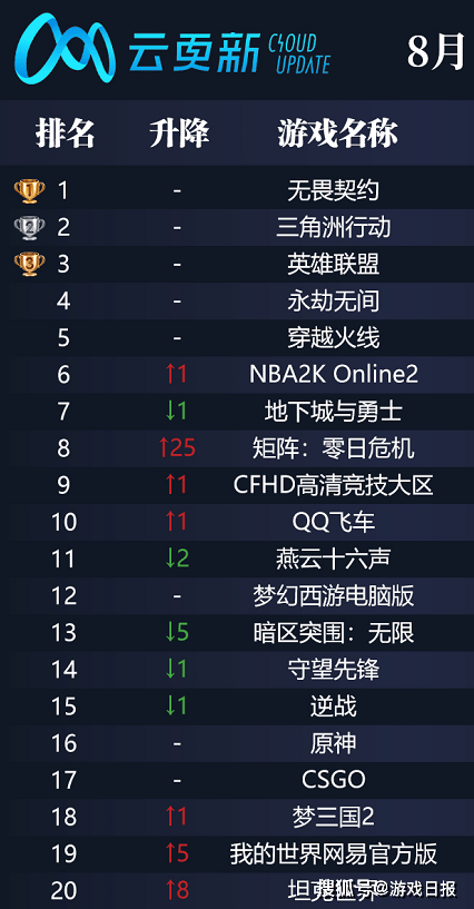 值得注意的是,在云更新月榜中登顶的《无畏契约》,据排名波动显示已至少连续两个月位居第一。这一表现并不出乎意料,ChinaJoy期间我们曾报道《无畏契约》展台热度盛况,加上暑期嘉年华等重要节点也在持续推动游戏热度上涨。