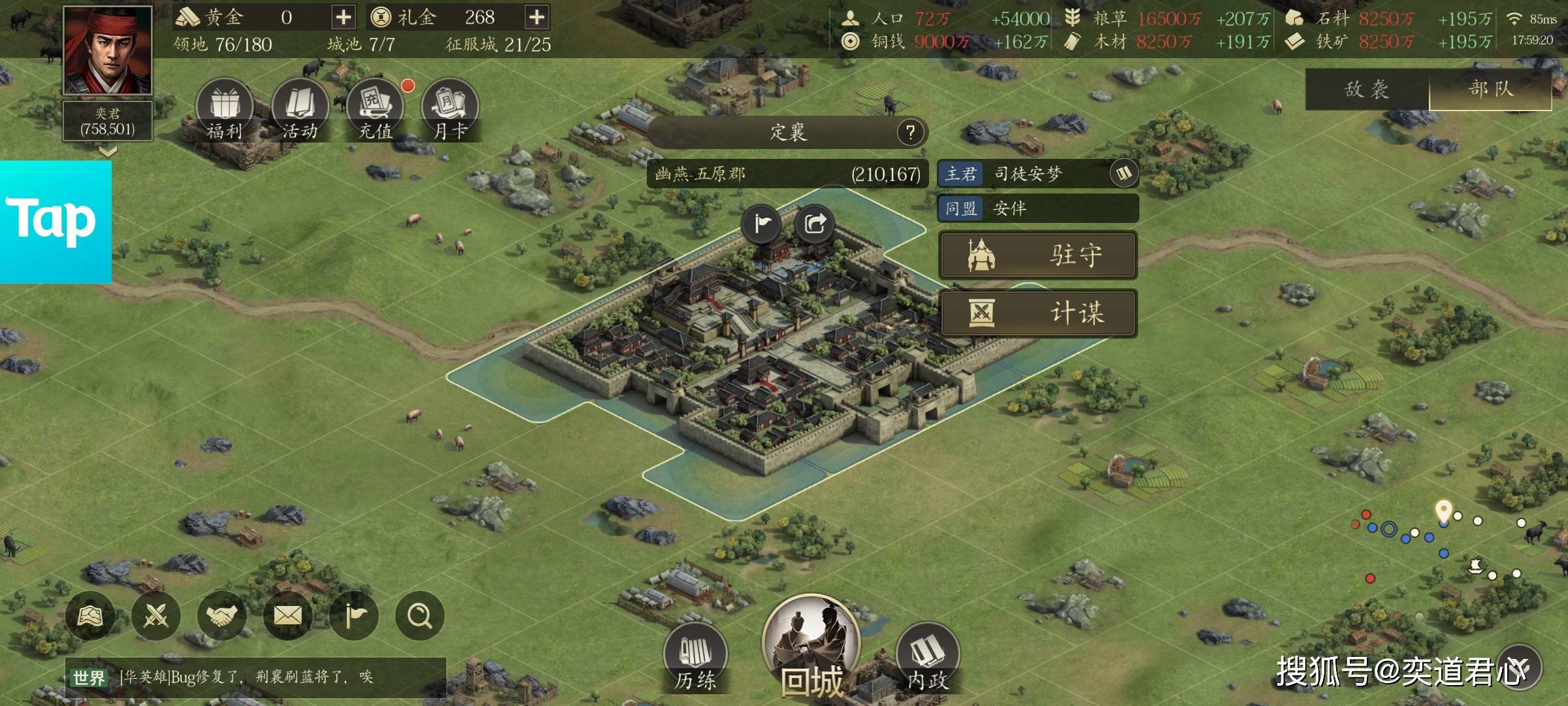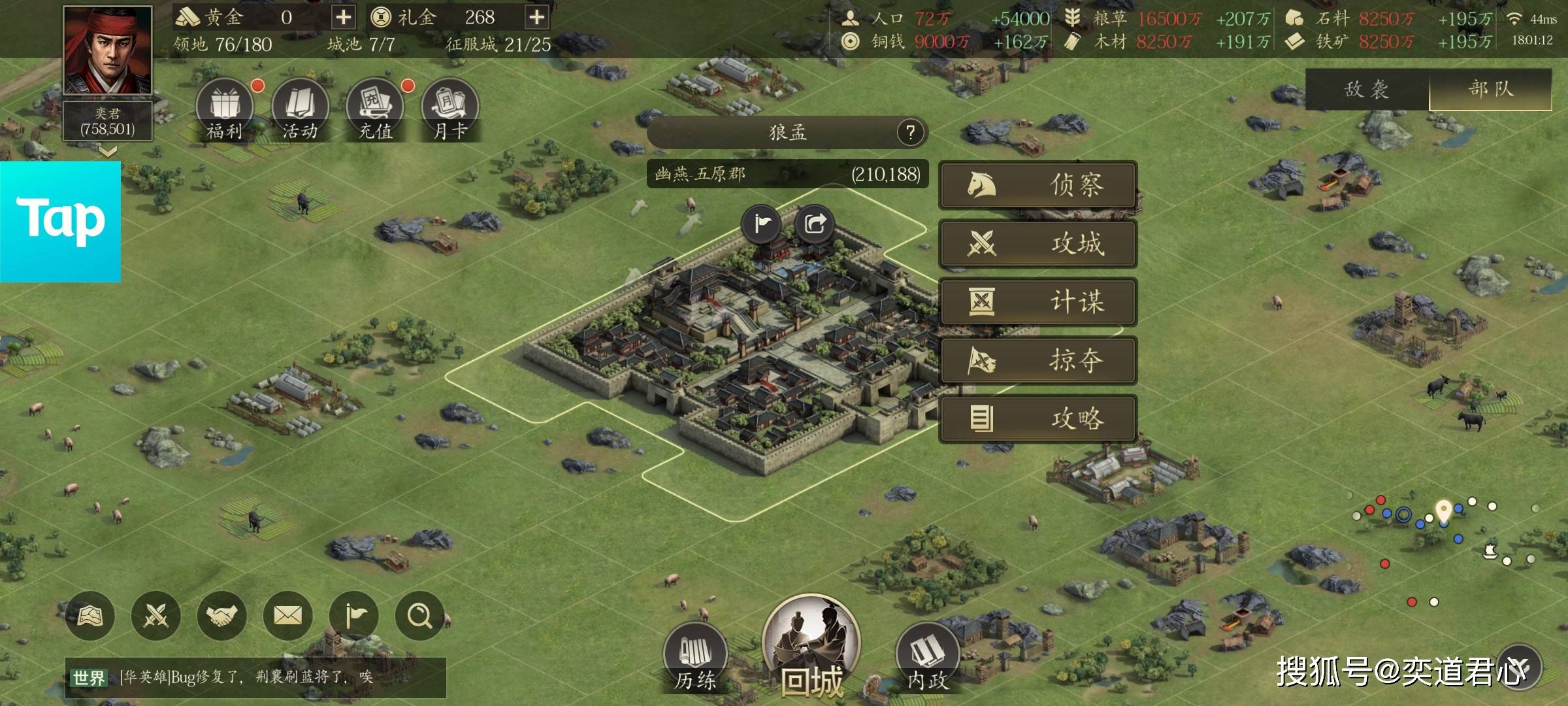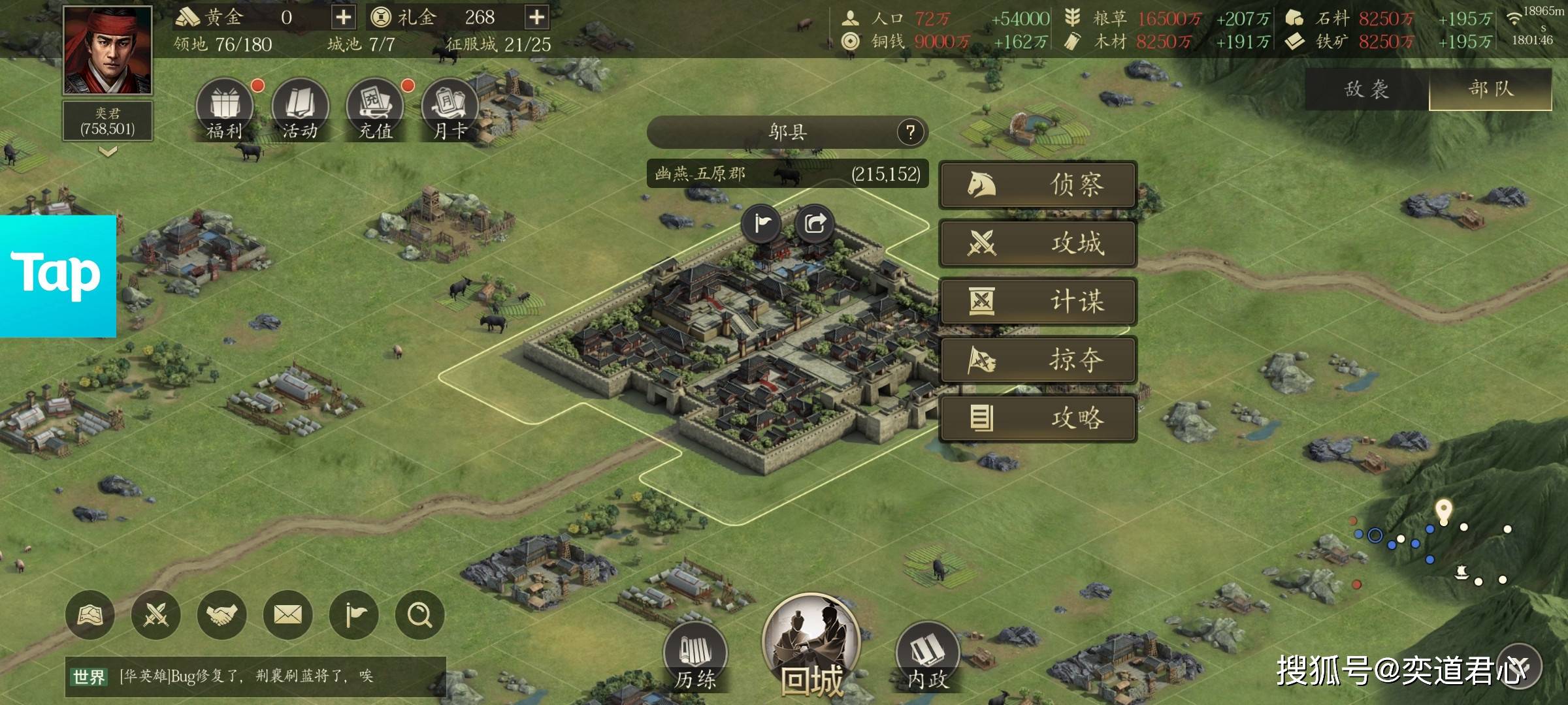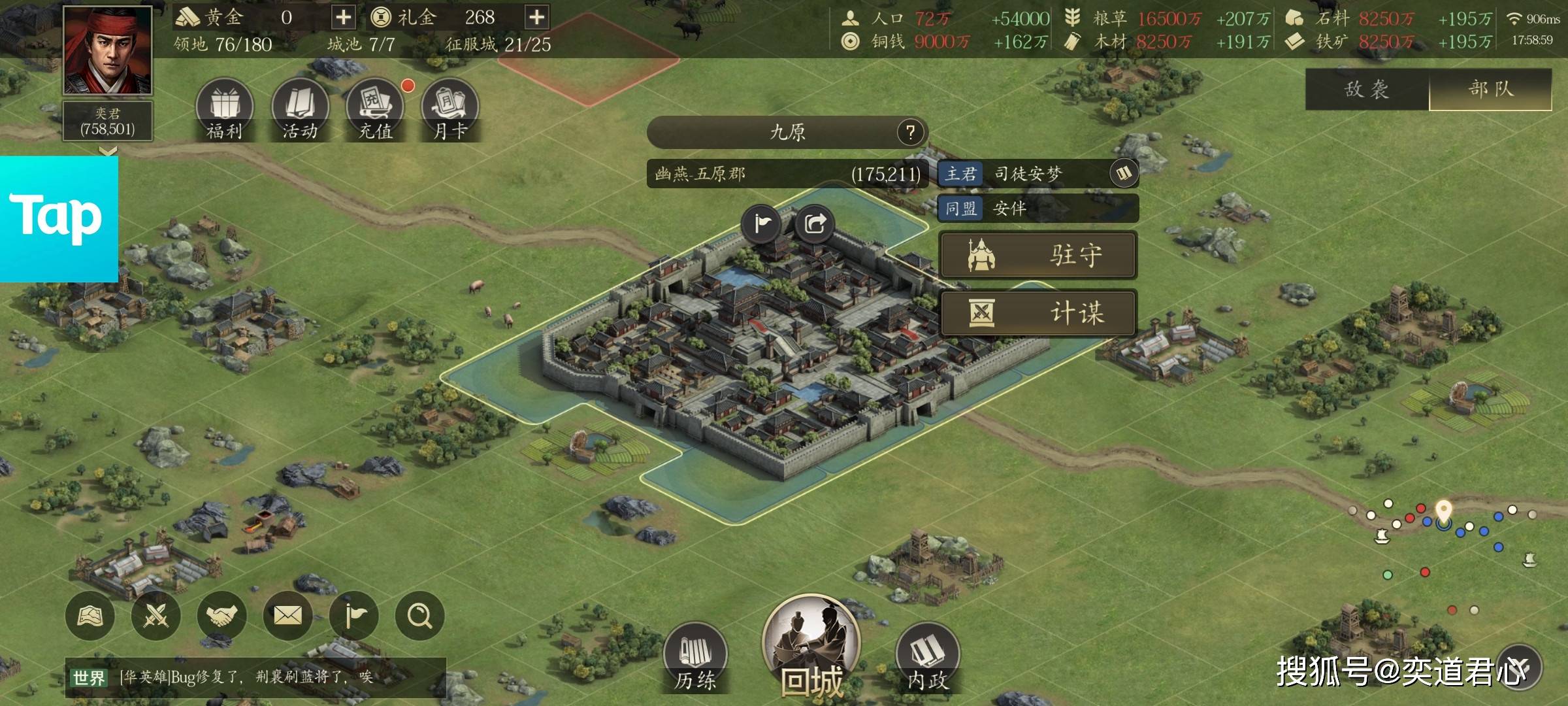 先来看看吕布的正牌老家九原,这里是整个五原郡的郡首府,游戏内坐标为(175,221)。攻克了这里,就能对五原郡下辖的全部城池和据点进行征兵、征税和征粮,目前有这个权限的是本公会的骨干司徒安梦,我就不来打扰他的场子了。