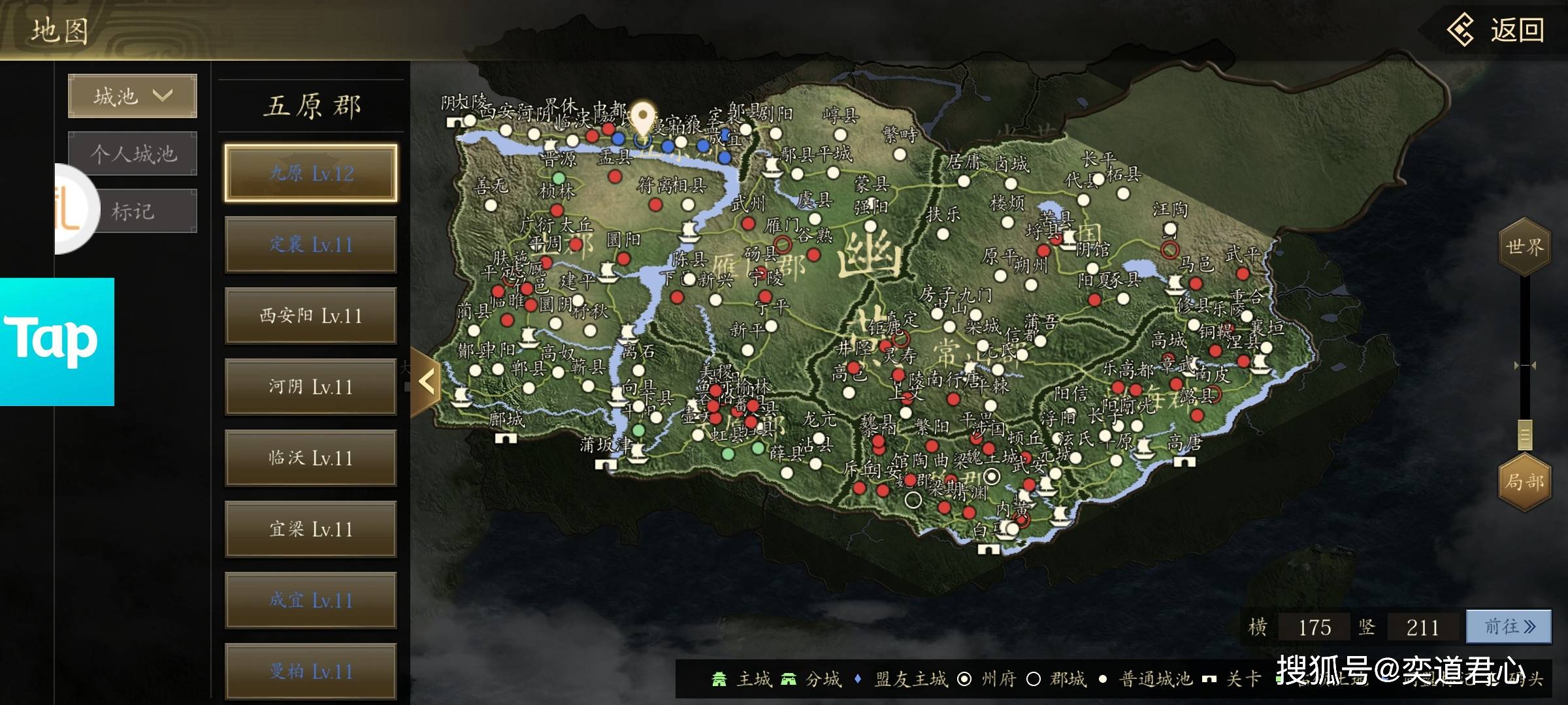 九原,隶属于五原郡的治下,这个细节也被taptap版《军令如山:王者之心》注意到了。我目前所处的游戏公会在这整个幽州地区的影响力比较低,不过好在占据了五元郡的核心部分,故而在最西北角落都是表示同盟领地的蓝色点。