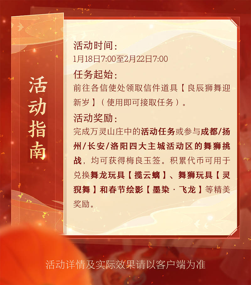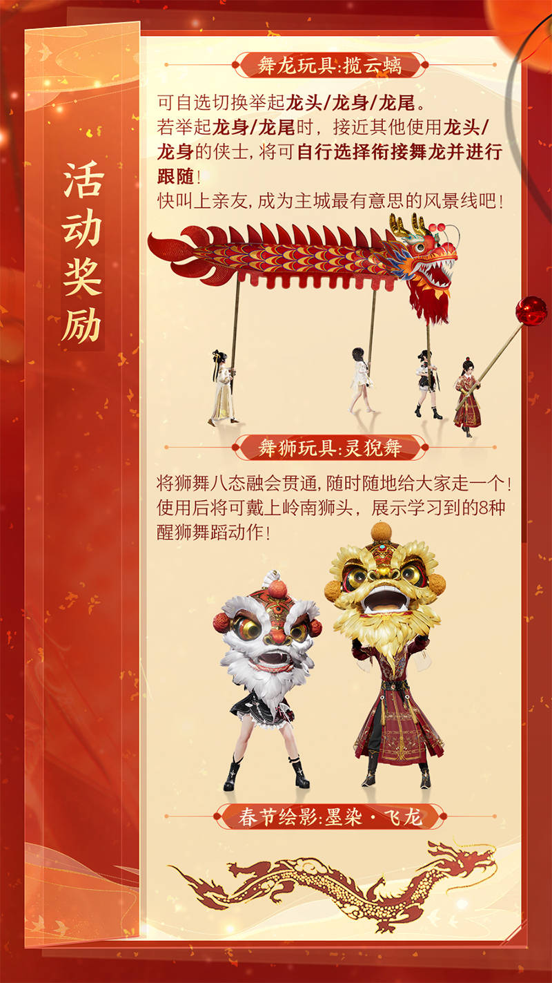 参与活动均可获得梅良玉签,可用于兑换舞龙玩具【揽云螭】、舞狮玩具【灵猊舞】和春节绘影【墨染·飞龙】等精美奖励!其中,舞龙玩具【揽云螭】将可与亲友配合,一起串联成长长长长长长长长的舞龙巡街游行,随时随地加入其中,做最有意思的风景线!爆竹除旧岁,舞狮迎新春,更多乐趣,亟待侠士们探索!