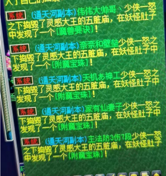 极光已经刷了一年的通天河,别说附魔宝珠了,就连价值超过30W的东西都没得过,可能这就是别人家的通天河吧!