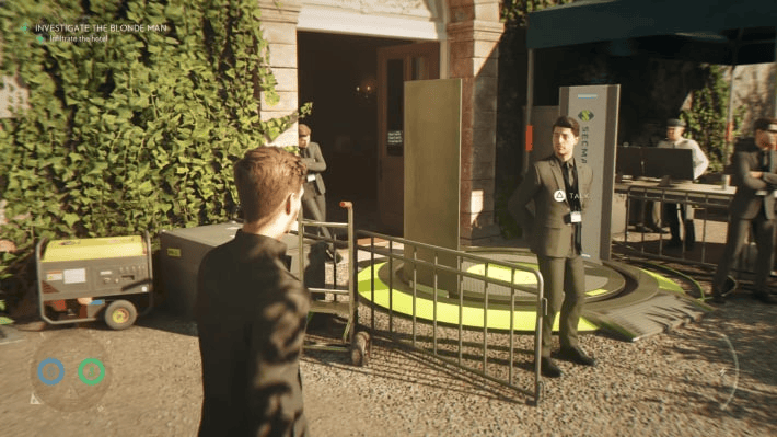 在《007 初露锋芒》的实机演示里,还有这么一个桥段:詹姆斯·邦德扮演成酒店门童,跟着形迹可疑的酒店服务员一路混进了目标所在的宴会中,可搞笑的是,邦德翻窗进入的场面却刚好被另一面服务员所目击,为了缓解尴尬,邦德张嘴就是一句瞎话:“我是反渗透检查员,有急事”,直接把对面给说愣了。