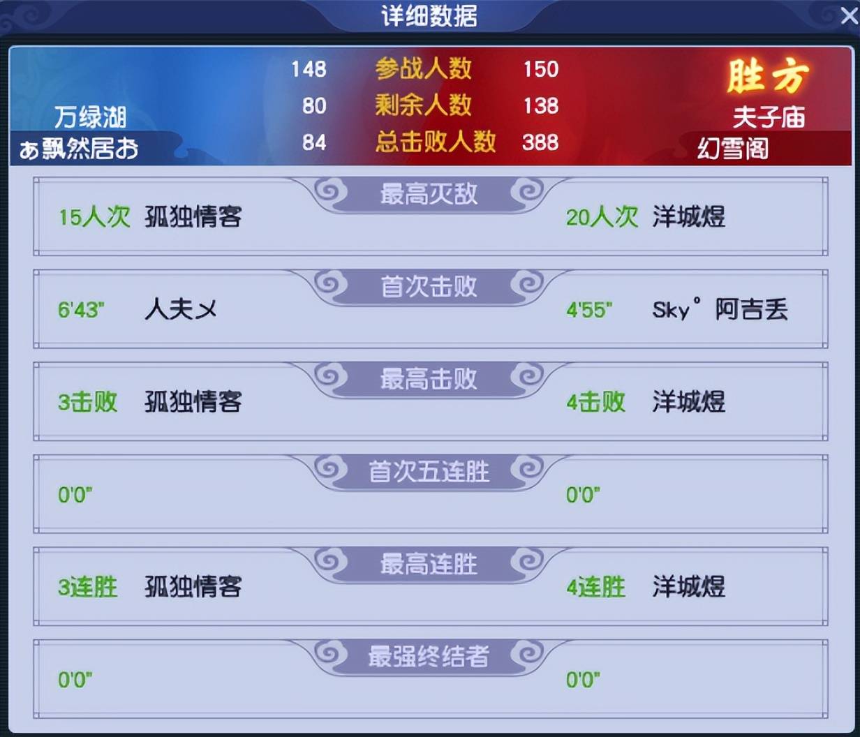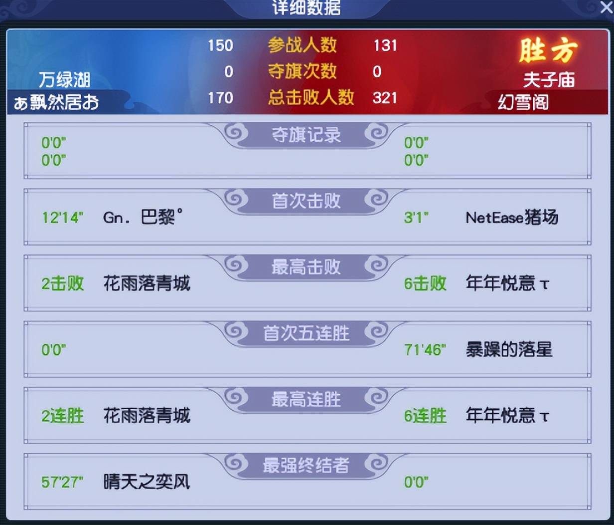 最终,【幻雪阁】在参战人数劣势的情况下,以321:170的总击败人数差距,拿下比赛胜利。