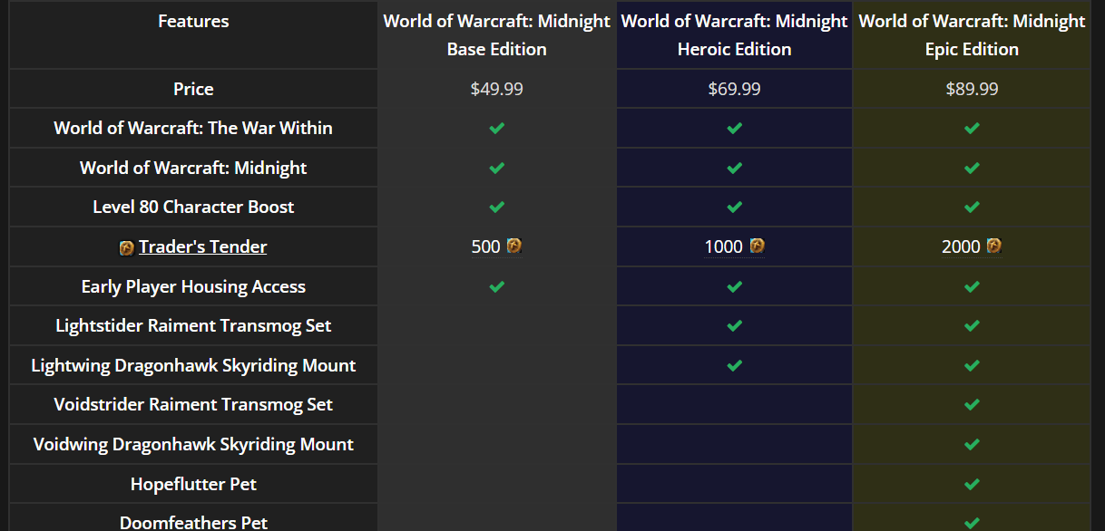 对比外服,美服数字版有三个版本,基础版售价为49.99美元,史诗版售价为69.99美元,典藏版售价为89.99美元。预购任意版本的玩家将在美服时间12月2日开启家宅系统的抢先体验。亚服和国服一样,也推出了英雄组合包和史诗组合包,购买礼包其一将在亚服时间12月3日开启家宅系统的抢先体验。跟国服不同的是,亚服史诗组合包还包含12.0的B测资格。