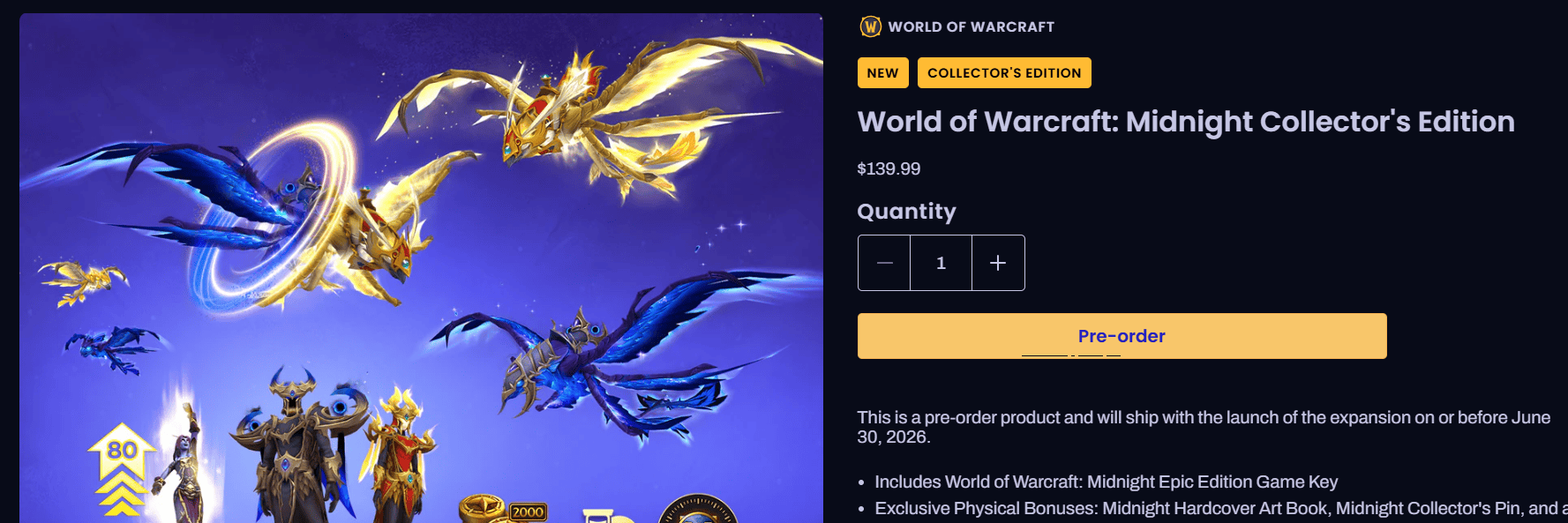 来自暴雪官网消息,《魔兽世界》12.0“至暗之夜”实体典藏版已开启预购,售价139.99美元,购买了典藏版的玩家将在美服时间12月2日开启家宅系统的抢先体验。