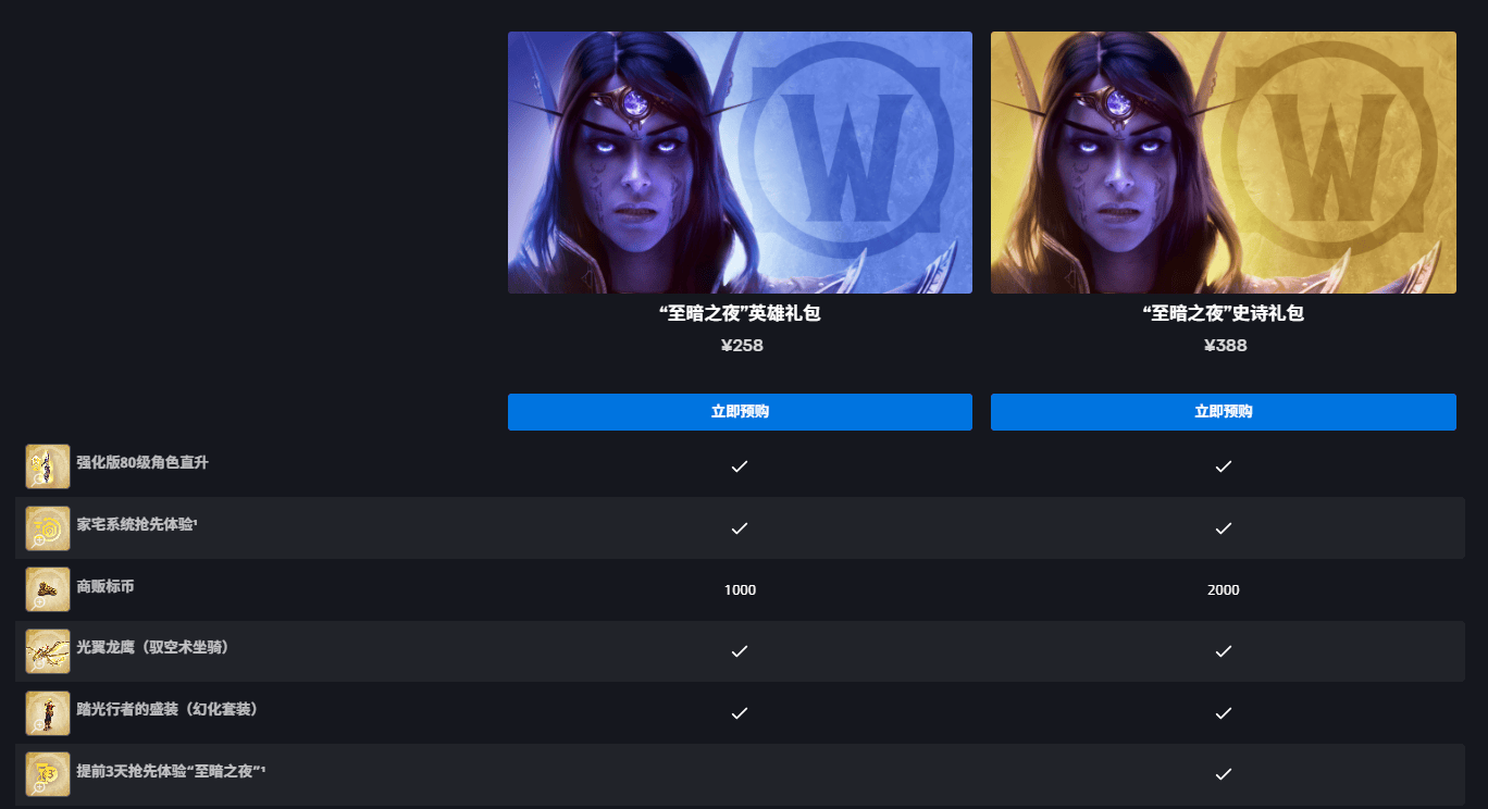 截稿之时,国服公告未更新,是否有实体典藏版还未知。由于国服不用CD-Key,无须购买新资料片,已推出了“至暗之夜”的两款数字礼包:英雄礼包和史诗礼包,分别售价258和388元,购买礼包其一将在北京时间12月4日开启家宅系统的抢先体验。