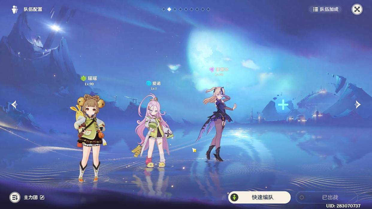 这个配队是这样的,瑶瑶、爱诺、菲谢尔和菲林斯,这个配队思路最大的一个特点,可能也是字面意义上的最穷配队了,瑶瑶作为璃月老角色,大多数玩家都已经有了,叠加上他们三个都是四星角色,基本上的玩家都有了,这个输出轴就很明显了,就是利用草行久的模式进行操作即可,丝毫没有什么特别大的英雄。