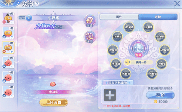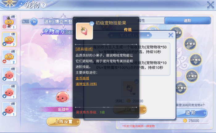 宠物技能升级:宠物技能不管是专属技能还是进阶技能,都可以使用初级宠物技能果来提升技能等级。初级宠物技能果:主要获取渠道为金币商城和诸神宝库材料当中获得。