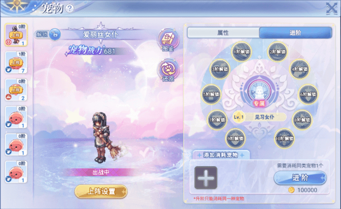 爱丽丝女仆:6阶:玩家物理攻击提升 7阶:玩家物理防御提升 8阶:玩家魔法攻击提升 9阶:玩家法力提升 10阶:玩家魔法防御提升