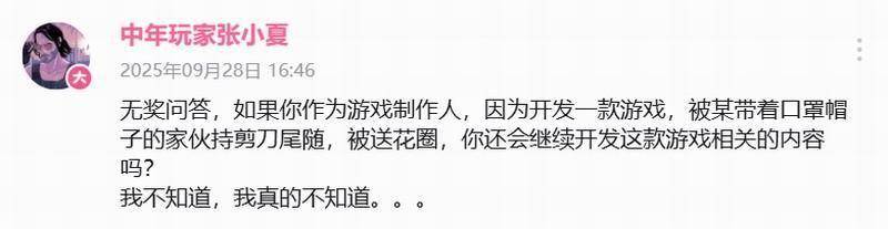 近日UP主中年玩家张小夏也谈到此事,他表示夏思源除了被送花圈以外,还被某个带口罩帽子的家伙持剪刀尾随。他说:“如果你作为游戏制作人,因为开发一款游戏,被某带着口罩帽子的家伙持剪刀尾随,被送花圈,你还会继续开发这款游戏相关的内容吗?”