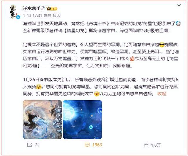 因为年关将至的关系,《逆水寒》手游这两天爆出来一个大料——游戏中将有价值上百万的新顶奢外观问世,包含一件顶奢时装与一只顶奢祥瑞,将在1月26日的新春版本推出。