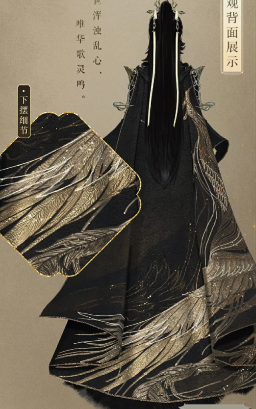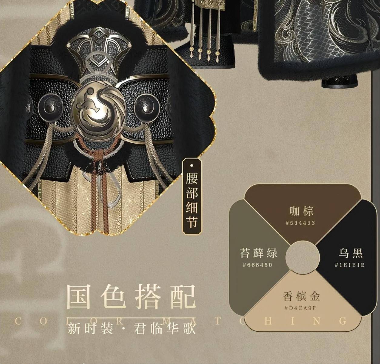 从图片来看,这套“君临”系列时装,不仅仅是在氛围渲染上展现了帝王之姿,更在时装设计上有着深厚的文化底蕴和精心的考究。“君临”新时装借鉴了中国传统文化中“天玄地黄”的天地寰宇配色理念,以玄黑色为底色,金色作为点缀,玄黑色象征着天穹的无垠与深沉,金色则代表着大地的丰饶与辉煌。这在无形中彰显出帝王之尊的庄严与神圣。
