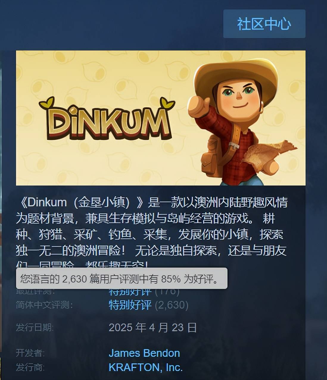 这是一款受澳大利亚内陆启发的生存、生活模拟游戏,由澳洲队里游戏开发者James Bendon一人打造,最初于2022年7月在Steam平台以抢先体验的方式推出——随后经过三年的优化和内容扩充,在2025年4月推出了正式版本。