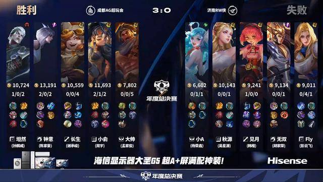 第三局小俞和坦然上场,拿了发育路蚩奼。这局的节奏稍微慢了一点,快八分钟钟意对小A的朵莉亚动手,小俞二技能拿下一血,这放在上一局已经快一波了。随后无双的杨戬狗到大帅,这应该是RW侠为数不多的反击了行为了,小俞的蚩奼进场瞬间被安琪拉晕住直接没了。但AG众人也没有放过fly,追到塔下将fly带走。这场比赛看下来,甚至还没有小俞的心率燃。打到最后AG也不管了,镜被杨戬狗中了,没关系不用后退,直接大招往里打。没有兵线也无所谓,顶着五个人的伤害强拆,等兵线进来一波拿下,3-0轻松零封。