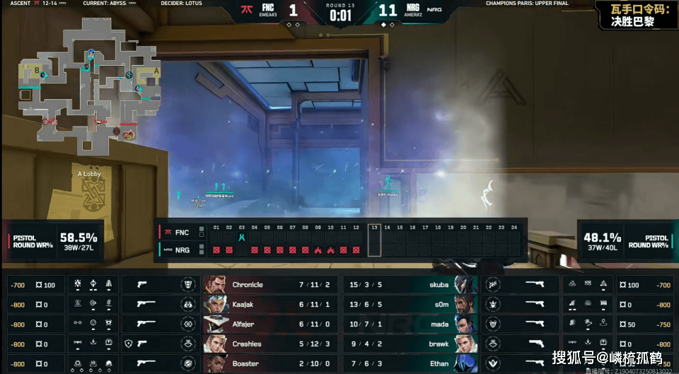 双方的图1是FNC的自选图亚海悬城,他们在这张图的胜率一直都不错,然而在上半场却被NRG打了一波8-4,着实让人非常惊讶,到了下半场,FNC拿下手枪局后,虽然在防守方整体打得还不错,但远低于他们平时的水平,NRG则靠着上半场的优势,下半场也是将比赛拖进了加时赛。