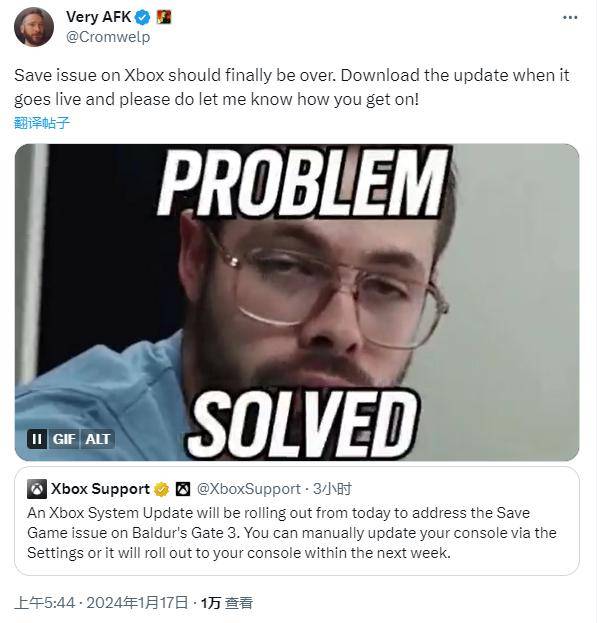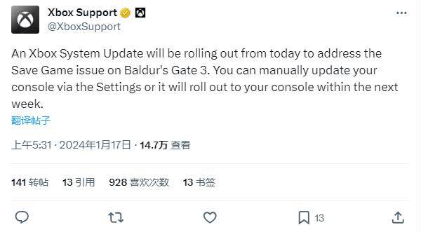 Xbox支持官推近日发文表示,最新的Xbox系统更新将从今天开始推出,以解决《博德之门3》上的游戏存档相关问题。玩家可以通过“设置”手动更新Xbox主机,或者等待将于下周之内推送的自动更新。
