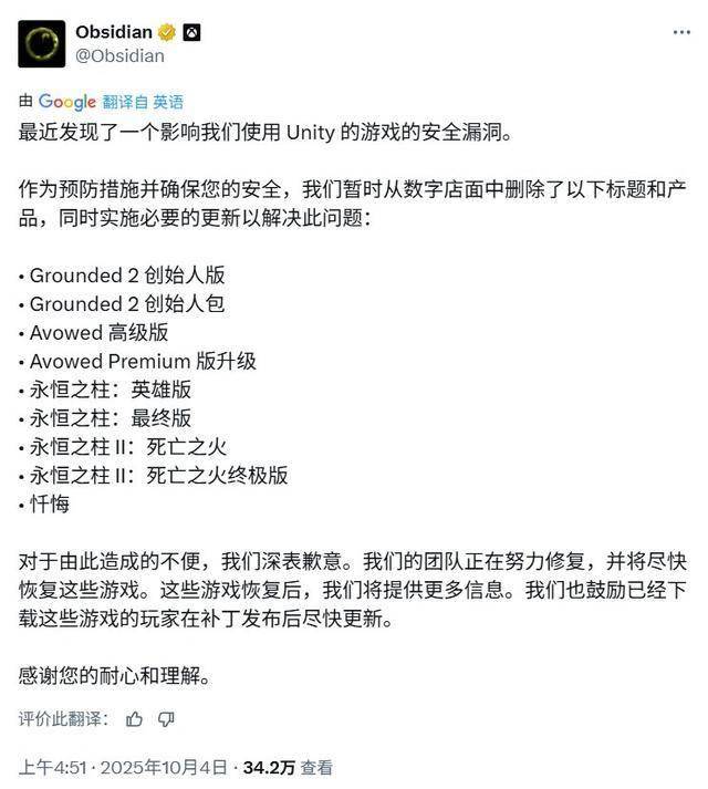 黑曜石娱乐在社交平台发布声明,证实Unity引擎存在安全漏洞(具体细节未公开)。为安全起见,包括《禁闭求生2》创始者版、《宣誓》高级版、《永恒之柱》系列及《隐迹渐现》在内的多款游戏已从Xbox商店、PlayStation商店及Steam等平台暂时下架,恢复上架时间待定。