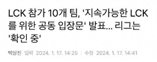 据韩媒报道,今日LCK众战队联合发布声明,控诉韩国拳头利润分配太少导致所有战队都在亏钱,以及担忧联赛架构不合理要求改革。首先,要求官方对以下问题做出具体答复。