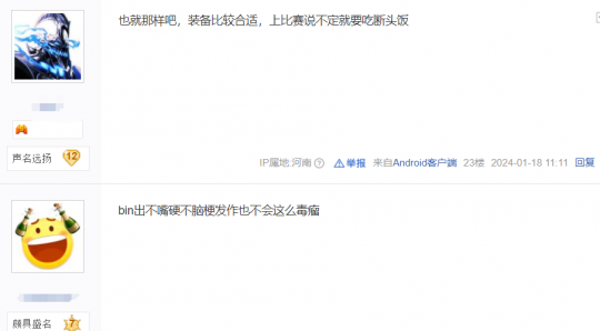 因为直播效果拉满的原因,有关Bin锐评乌迪尔的言论也传到了抗吧网友耳中,不少人都表示Bin确实是成熟了很多,现在不嘴硬也不毒瘤了,总算能跟着版本玩英雄了:“从五楼不情不愿地选到一楼抢”,“真邪门了,用别的英雄一直c就是赢不了,用乌迪尔送反而赢了”,“你是要笑着输还是哭着赢”……