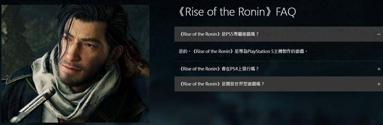 近日《浪人崛起》PS商店页面更新,在FAQ栏目中列举了三个问题。官方再次确认《浪人崛起》是PS5独占游戏,是专为PS5主机制作的游戏。这似乎也说明,该作是长期独占而不是限时独占?