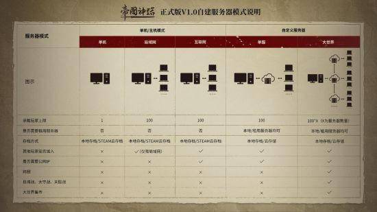 1、自建服务器模式说明。除官方服务器外,《帝国神话》正式版V1.0还将包含5种自建服务器模式,单机/主机模式包括单机、局域网、互联网自建模式,自定义服务器则包括单服、大世界服务器组模式,几种服务器模式的差异如下图,对应的开服方式及具体要求将在正式版V1.0上线前予以说明。