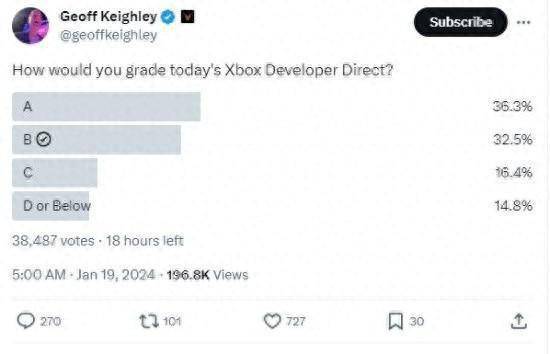 TGA创始人Geoff Keighley今日发起了一个投票:你如何评价今天的Xbox Developer Direct?几档投票分为A、B、C、D。根据投票结果显示,有36.3%的玩家打出A档,32.5%的玩家打出B档,C和D档则分别为16.4%%和14.8%,综合看出玩家中满意者仍占多数。