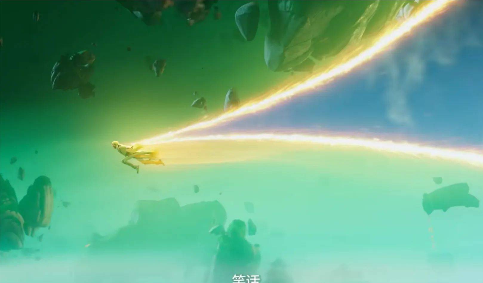 李白一剑划破天空,这个时候大家仔细去看,原本从绿色无光的天划破之后,照亮进来的是金色,是光。