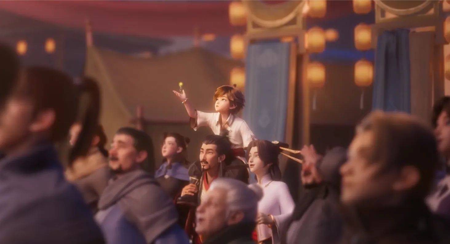 画风一转,李白又回到了儿时,回想到了曾经骑在父亲肩上看街上热闹的场景,这是多少人小时候都经历过的画面。