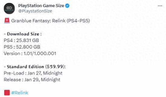 推主PlayStation Game Size带来了PS版《碧蓝幻想:Relink》的容量情报。PS4版大小为25.831GB,PS5版为52.8GB。游戏将于1月27日开启预载,1月29日正式发售。