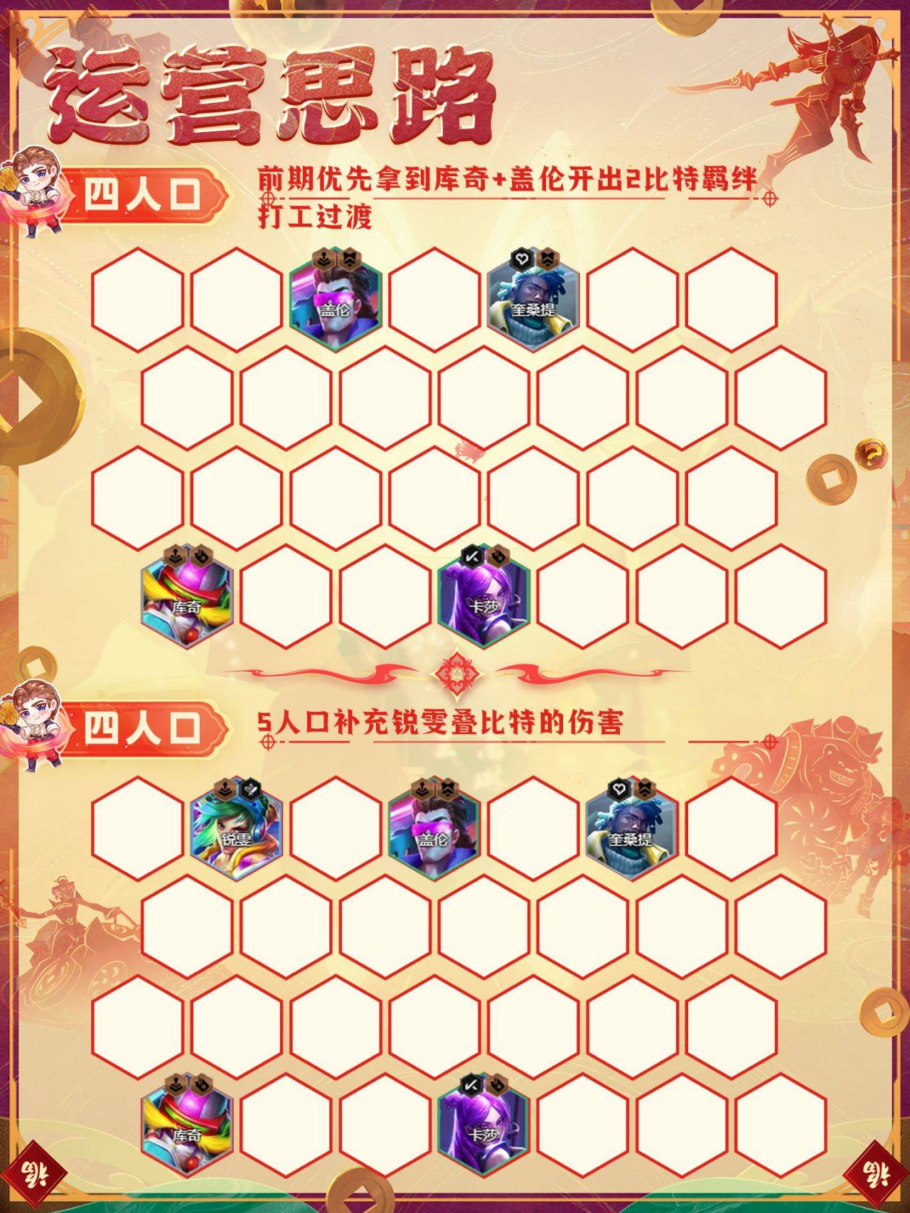 阵容思路:比特羁绊优先考虑开出2比特去叠比特伤害,因此开局优先拿盖伦+库奇开出2比特羁绊打工过渡。其他羁绊可以补充秘术卫士、大碗射手即可