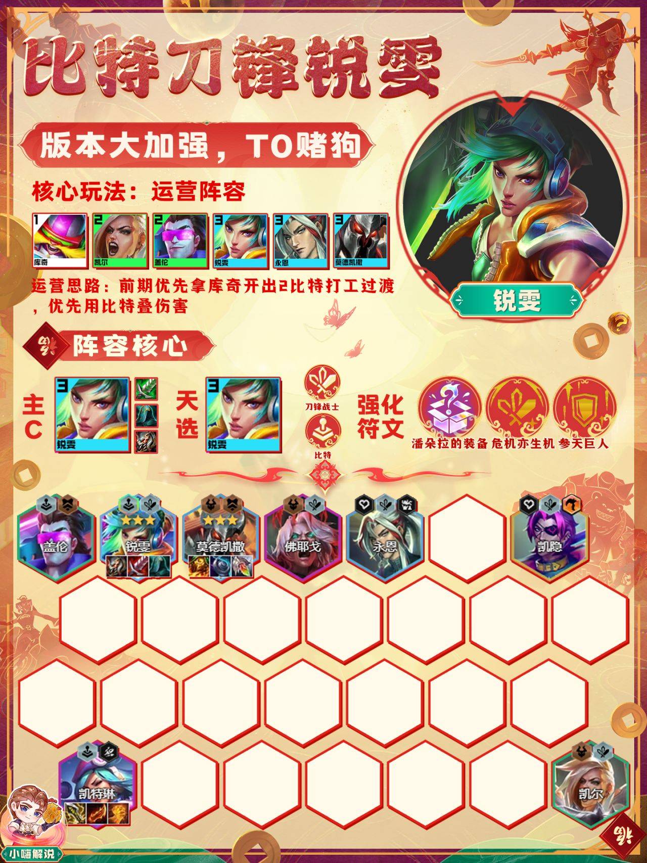 但是版本削弱了库奇和女警的伤害,而比特扛把子锐雯没有被削弱,因此小嗨推荐当前版本比特的思路,还是以锐雯为输出核心,女警当副C,后期阵容上限在于6比特(有比特转职的5费卡)打出爆机!