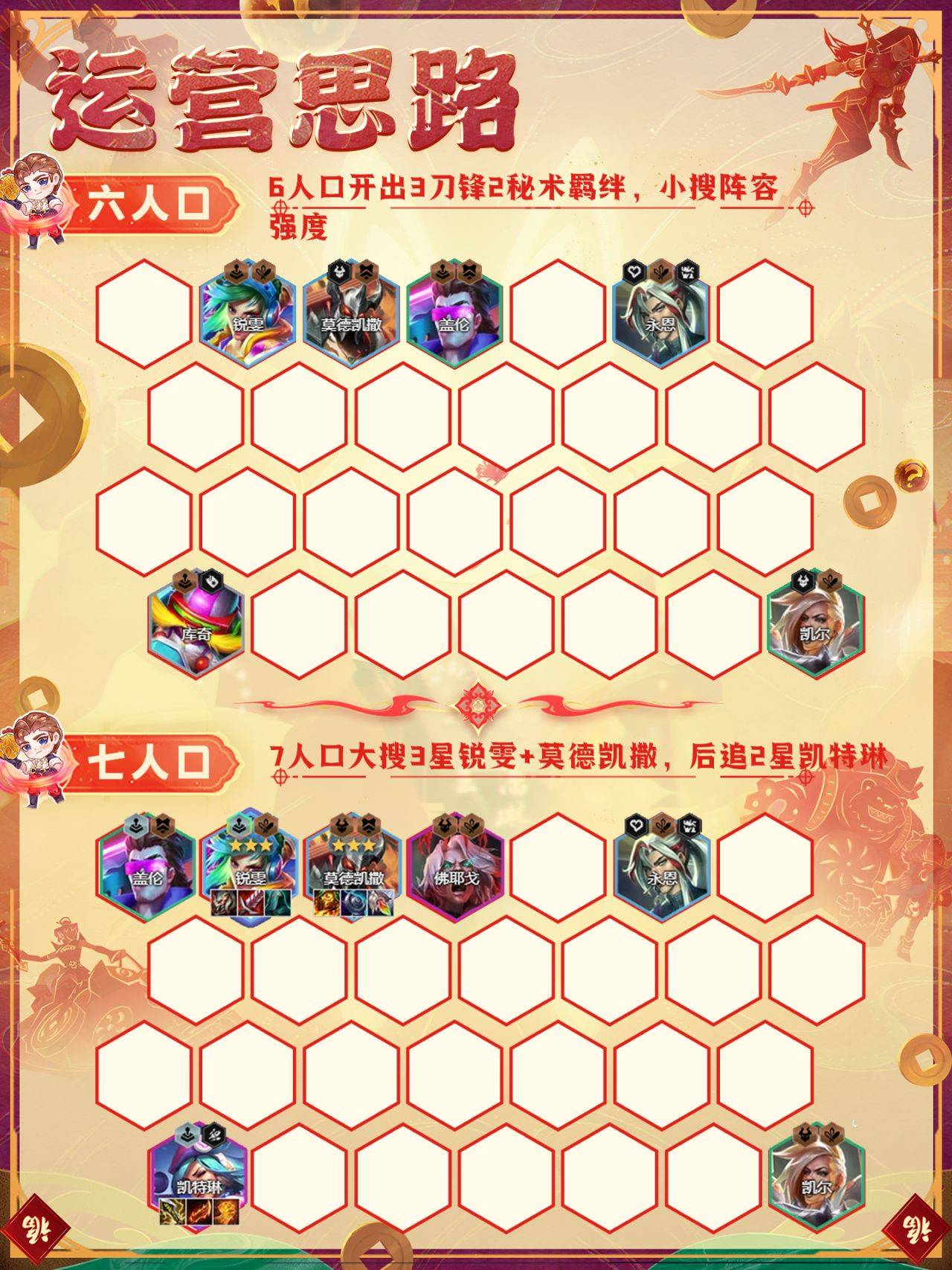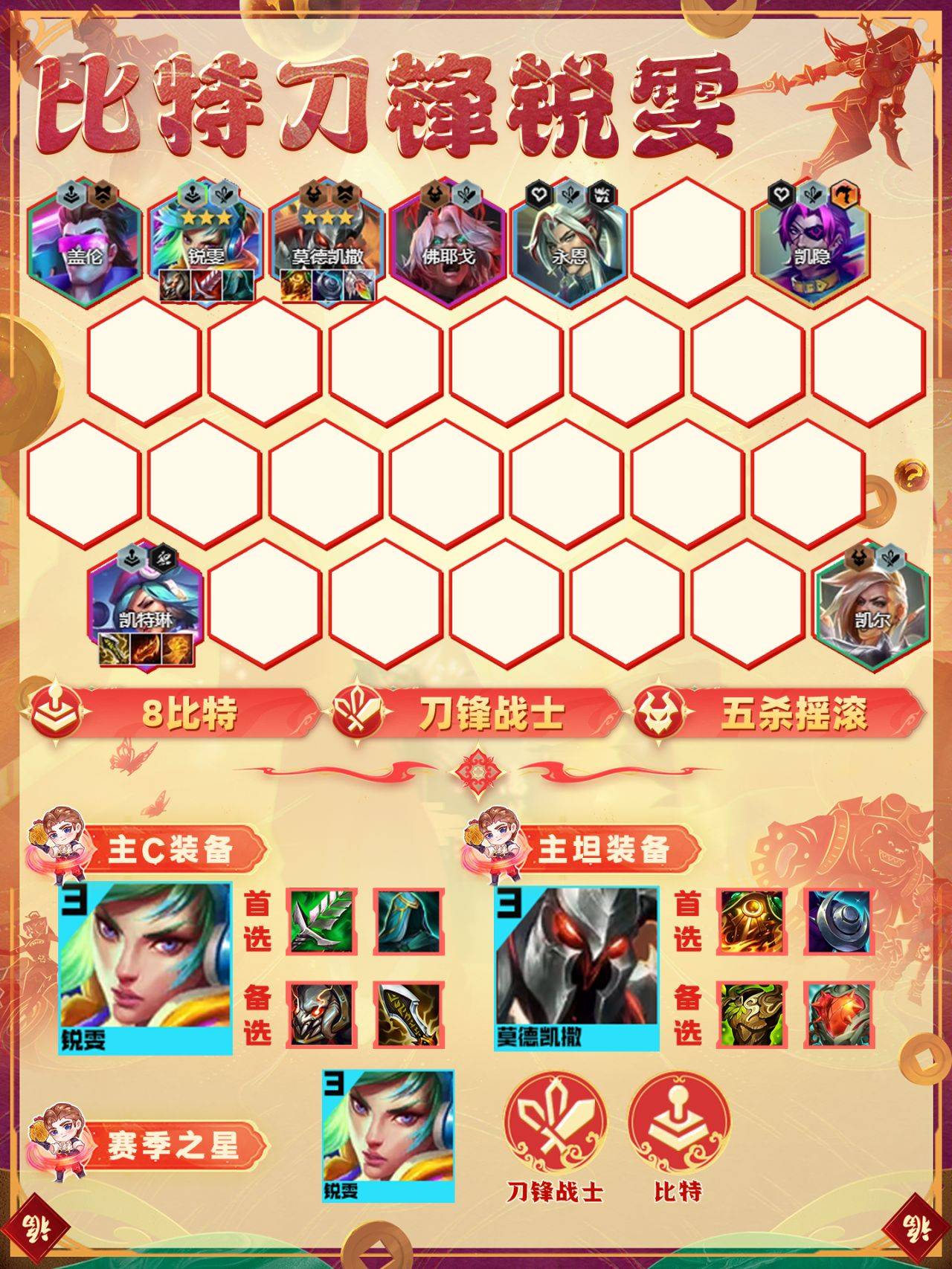 7人口卖掉前期的天选,大搜天选锐雯,补充佛耶戈和凯特琳开出4比特3刀锋3五杀羁绊。后期存经济追3星锐雯+莫德凯撒,锐雯3星直接拉8人口