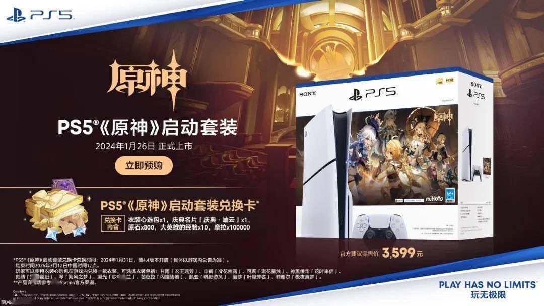 PlayStation中国公布“PS5《原神》启动套装”,1月20日开启预售,1月26日正式发售,建议零售价3599元。