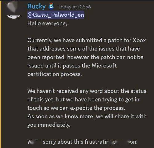 不过玩家们也不必太过担心,据@LukeDaviesMUFC消息,根据《幻兽帕鲁》的开发者在官方discord发布的消息,开发团队已经为Xbox版本游戏提交了一个补丁,来解决玩家反馈的的一些问题。