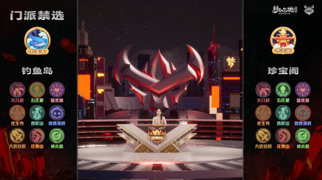 在禁选环节中,钓鱼岛被禁五庄、化生,珍宝阁被禁地府、化生。这就意味着,钓鱼岛无法使用双封体系的阵容,珍宝阁无法使用点杀体系阵容。不过,由于钓鱼岛携带了1100W战神,只要阵法不被克,即便选国标阵容也能拿到一定优势。