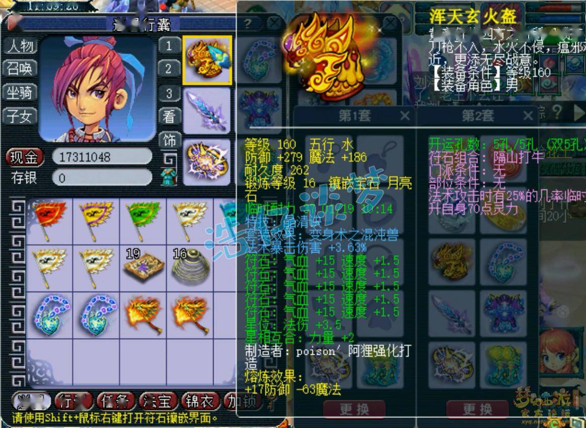 160级带晶清诀的混沌兽套男头,附加法术暴击伤害+3.63%,打了16锻月亮石!
