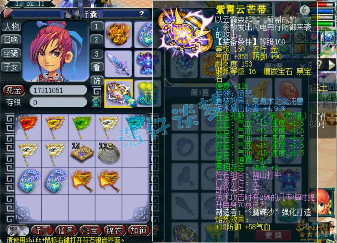 前两天给大家展示了两个很不错的法系,两个都是比较偏向于刷任务,一个是带了全身高等级不磨动物套,另一个是带了全身法术暴击伤害的装备,各具特色!为什么说他们更偏向于刷任务呢?一是因为他带了不磨装备,二是因为他们都没有携带特技,PK中操作不太灵活,只要被封就比较难出手!看完了任务法系,本篇文章浩仔再给大家展示一个PK法系,这个号堪称梦幻法系的天花板,每一件装备都是孤品的存在,宝宝更是令其他普通服战队望尘莫及!他就是来自珍宝阁服战队的——风雪一程,一起来看看吧!