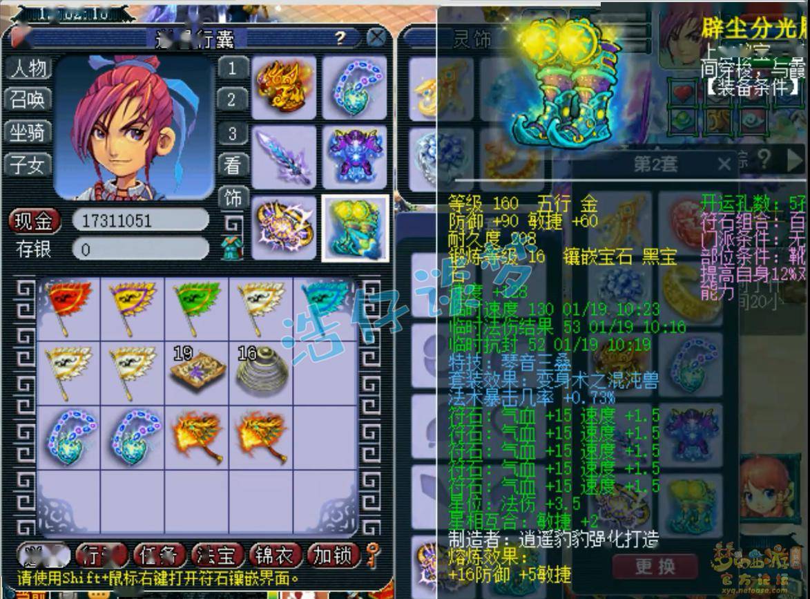 160级带琴音三叠的混沌兽套鞋子,附加法术暴击几率0.73%,打了16锻黑宝石!