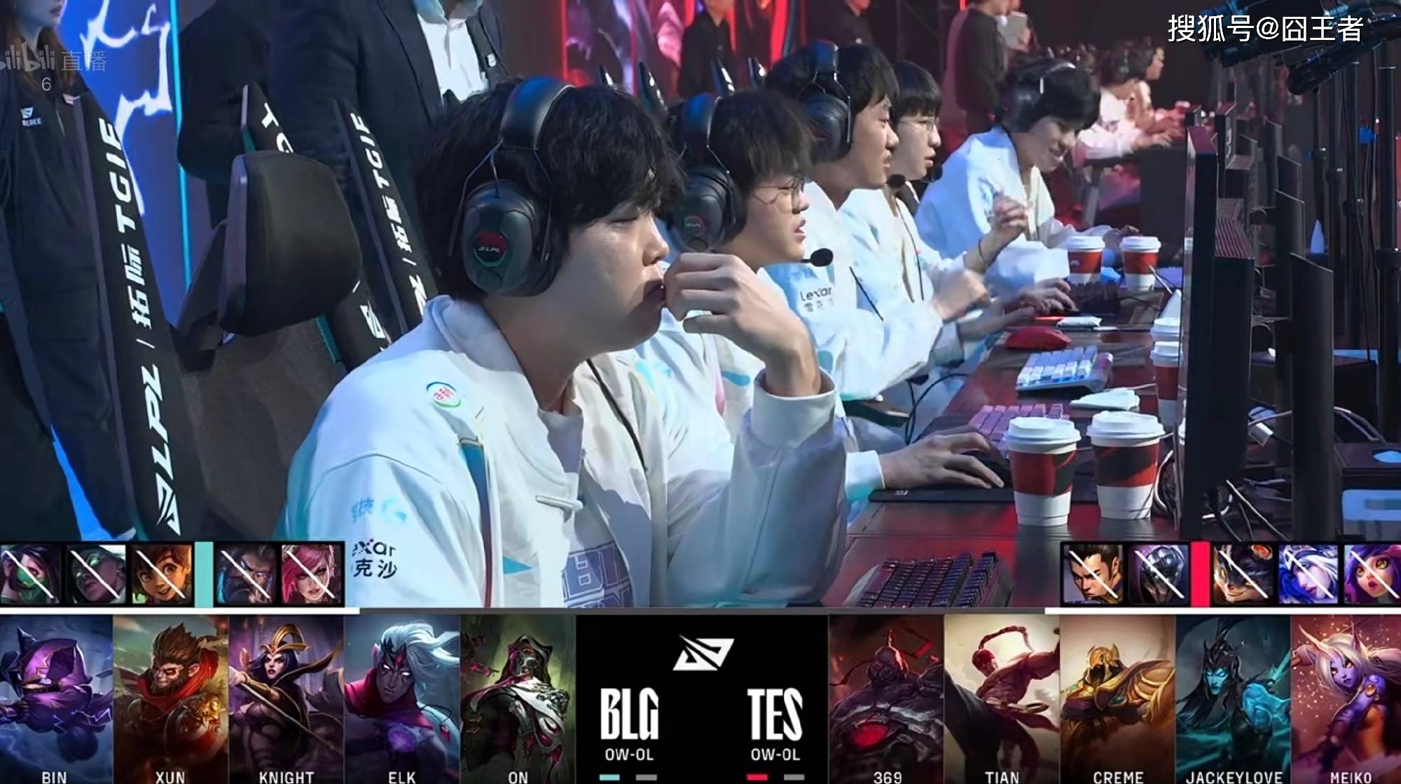 决胜局中,BLG选择了韦鲁斯和烈娜塔的强对线组合,而TES则是貌似在以赛代练,继续头铁卡莉丝塔,辅助则比较冷门的索拉卡,来应对BLG的消耗。上中野方面,BLG依然喧闹着了高爆发的阵容。