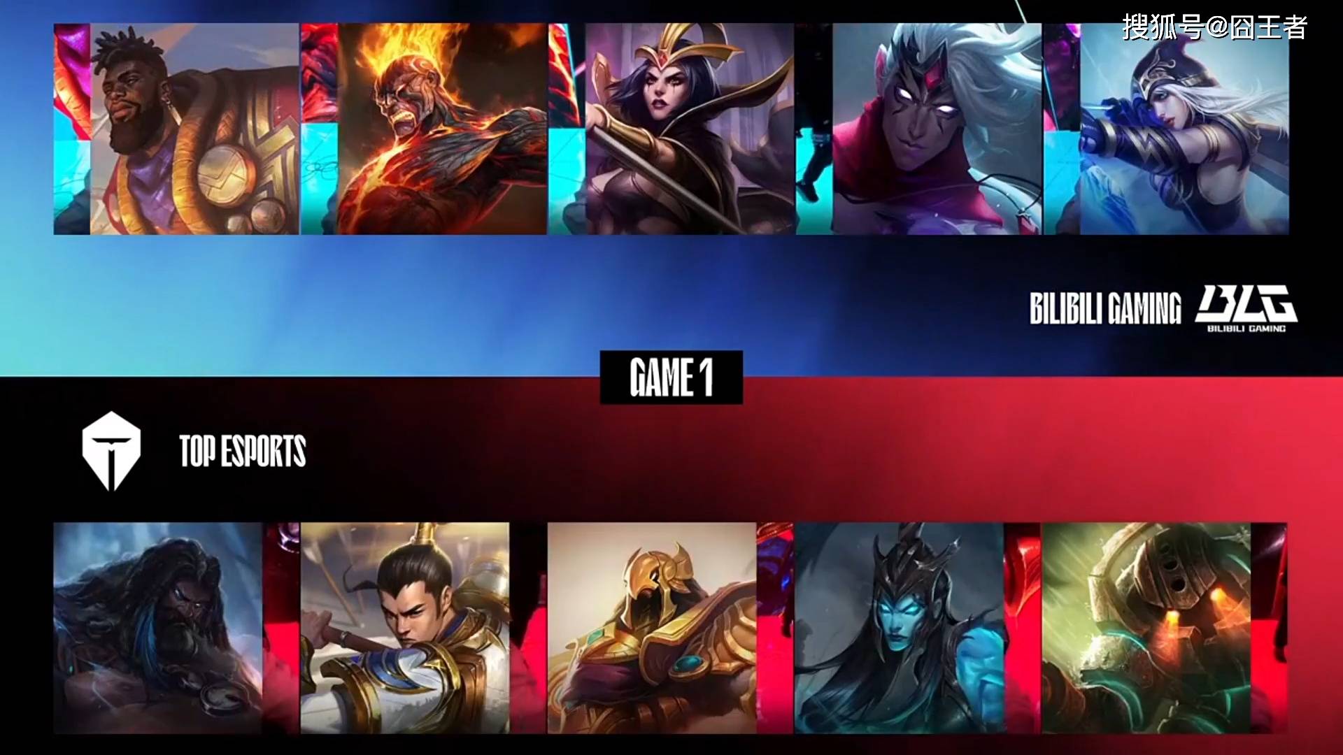 第一局比赛,BLG蓝色方,禁用阿卡丽、赛娜、米利欧、奥恩、蔚,选用奎桑提、火男、妖姬、韦鲁斯、艾希;TES红色方,禁用兰博、妮蔻、发条、贾克斯、盲僧,选用乌迪尔、赵信、沙皇、卡莉斯塔、泰坦。