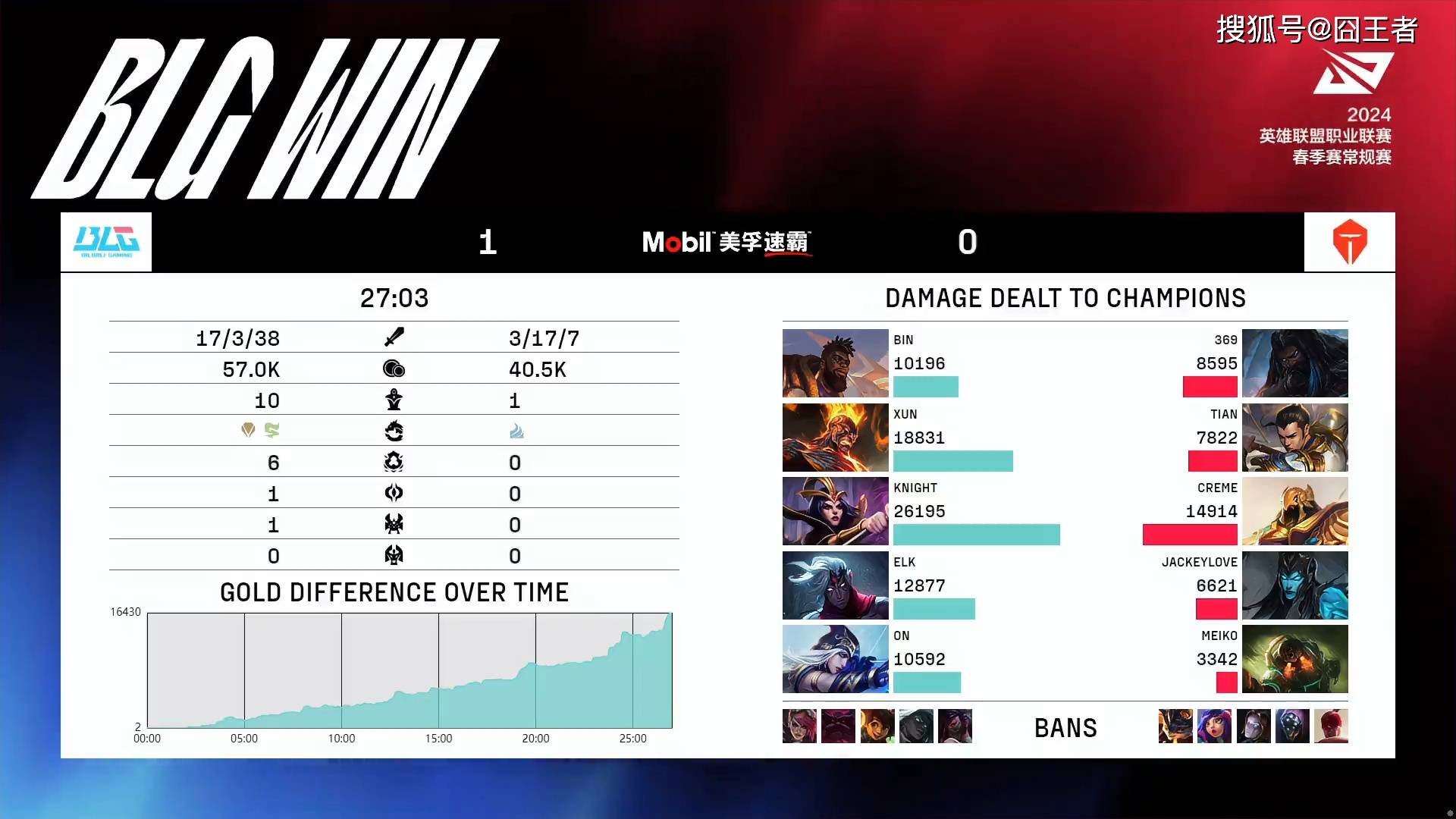结果第一局比赛,被BLG打成了典型的一面倒:BLG通过前期,乐芙兰在野区抓到赵信,打崩了TES的节奏;随后布兰德的节奏,更是走到哪儿都能抓到人,并且控下了全部的虚空巢虫和先锋。随着雪球的滚动,BLG在中期的经济积累非常快,TES几乎没有什么还手之力。最终在27分03秒,BLG以超过一万经济的巨大优势,轻松打出碾压局。