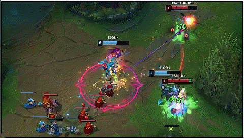 随后的小龙团战,TES打出不错开团先手,成功击杀一人,但后续被BLG战队反杀两人,TES后撤后没有回家之后进攻中路防御塔,抓住机会反推韦鲁斯完成击杀,但后续继续进攻中路,被BLG打出反击,妖姬TP配合正面先手直接击杀两人,TES还是亏。