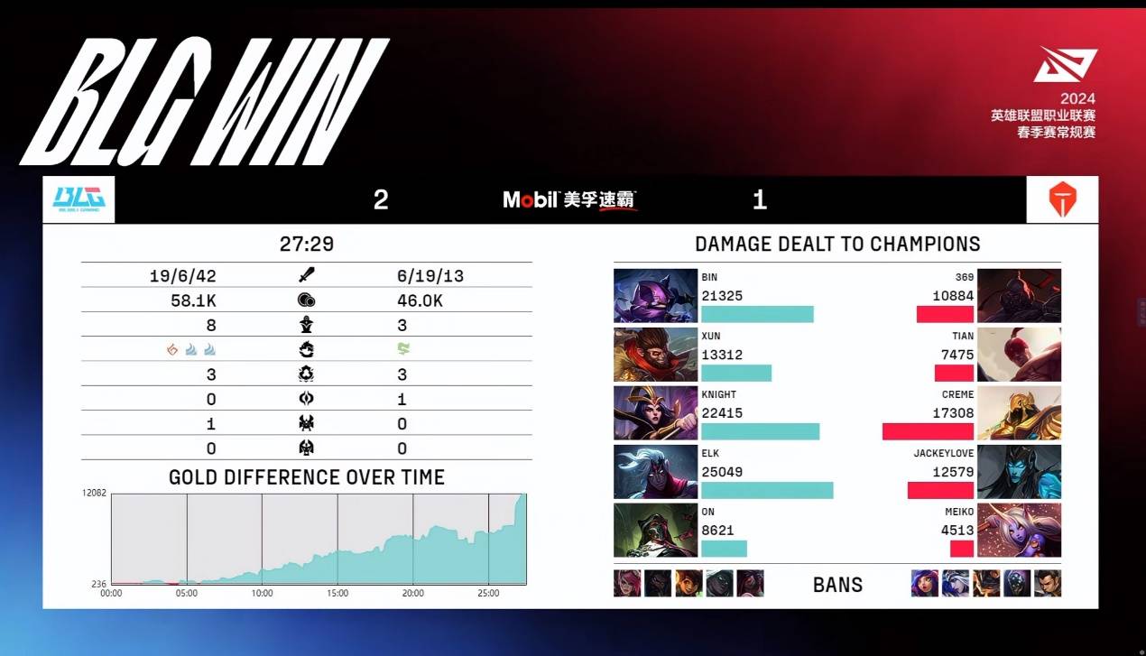随后Knight妖姬野区被抓阵亡,BLG随后抓住盲僧也完成击杀,果断选择打大龙成功拿下,大龙推进下路的一个过程中,Elk展现出了非常高的伤害,BLG选择直接越塔开团先手一波团战大获全胜后拿下比赛胜利。